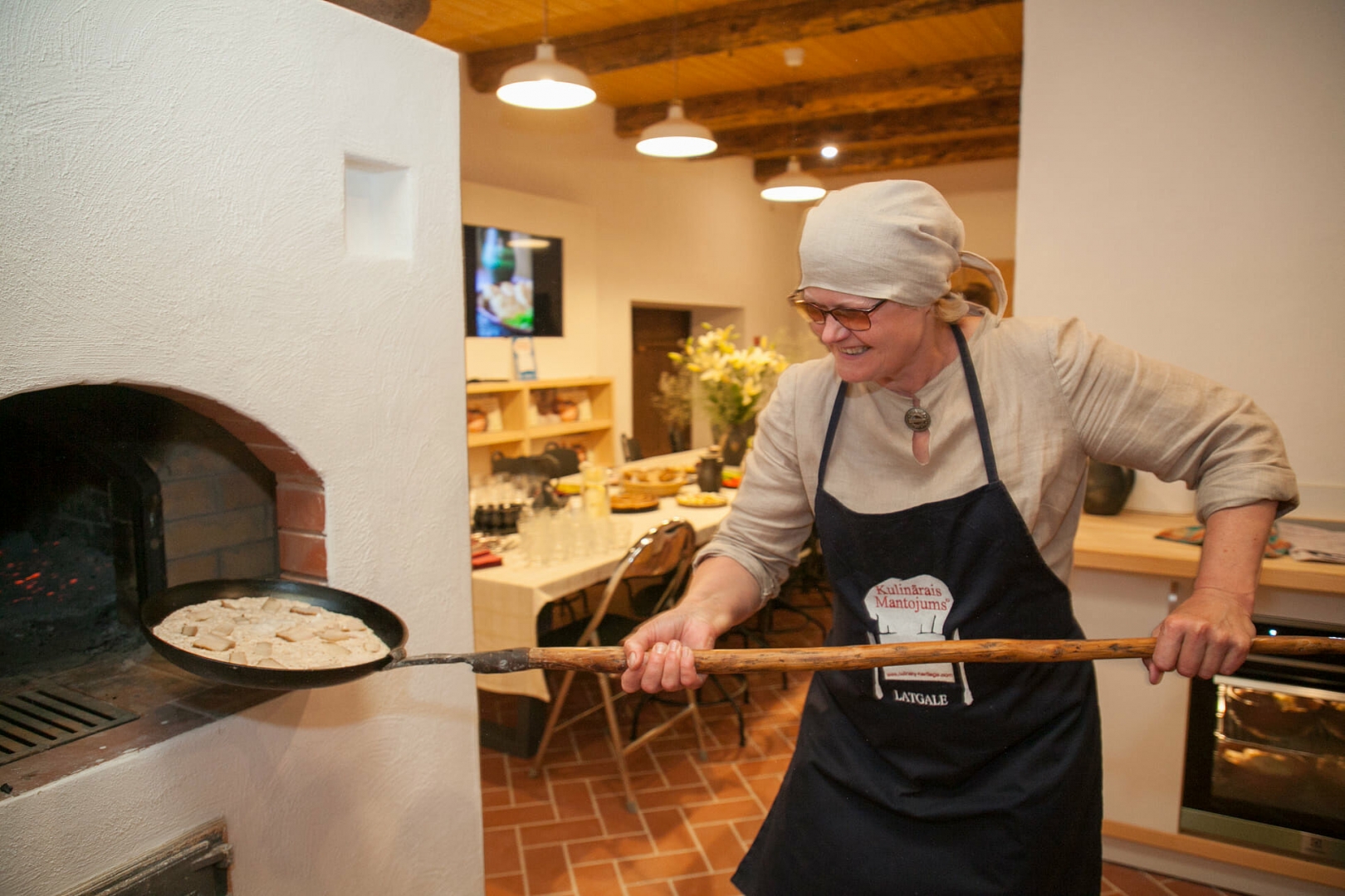 Sieviete liek pannu krāsnī