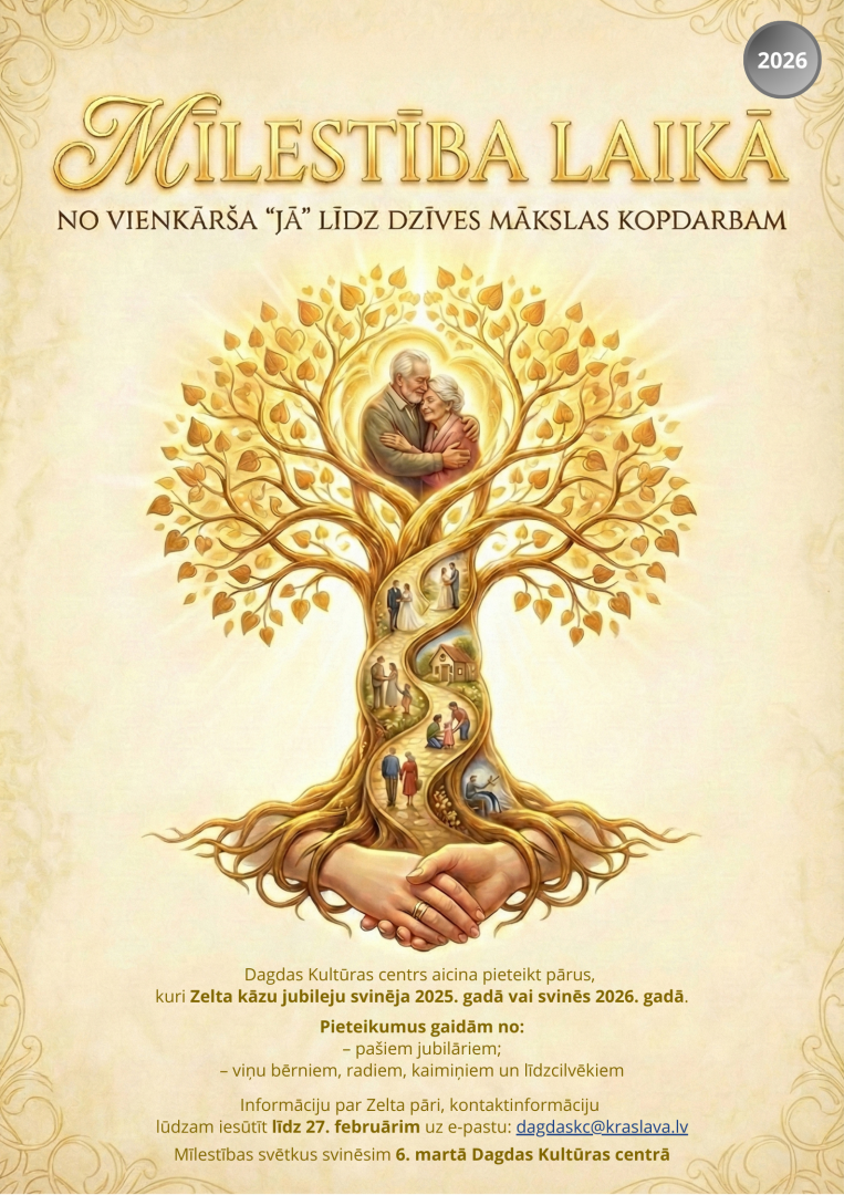 Dagdas Kultūras centrs aicina pieteikt pārus, kuri Zelta kāzu jubileju svinēja 2025. gadā vai svinēs 2026. gadā.