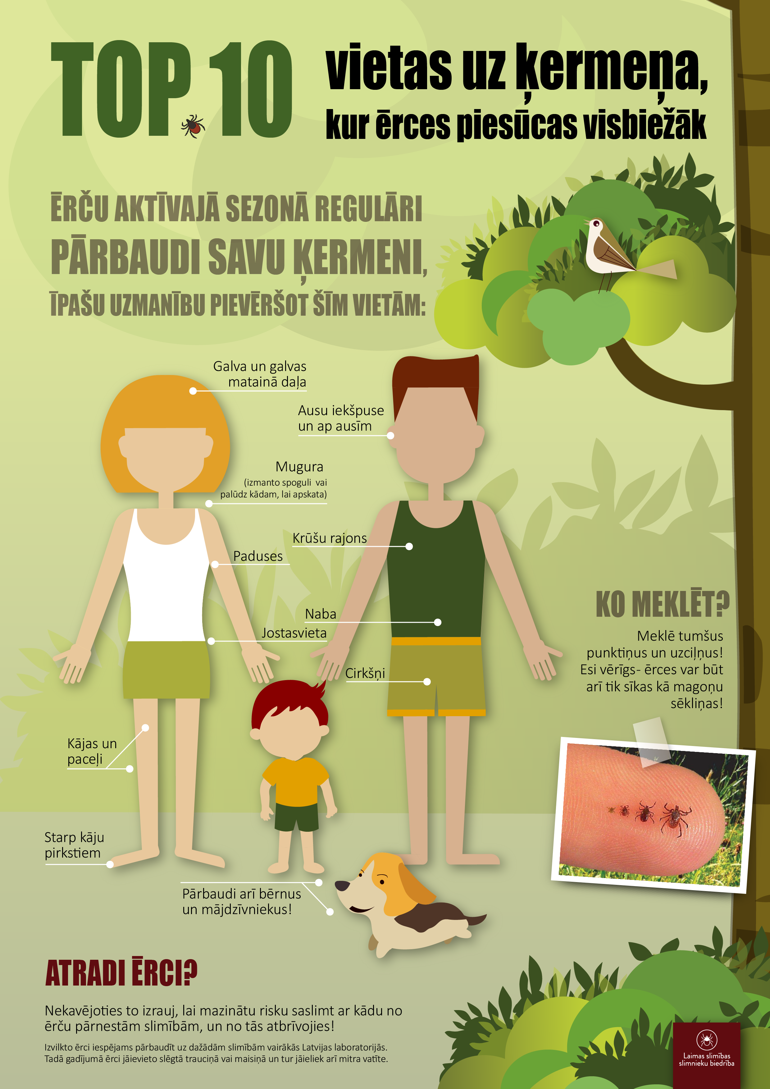 Laimas slimības izpratnes veicināšanas mēneša ietvaros Laimas slimības slimnieku biedrībs sagatavoj infografiku “Top 10 vietas uz ķermeņa, kur ērces piesūcas visbiežāk”, lai veicinātu iedzīvotāju zināšanas par ērcēm un to, kā sevi pasargāt no ērces piesūkšanās.