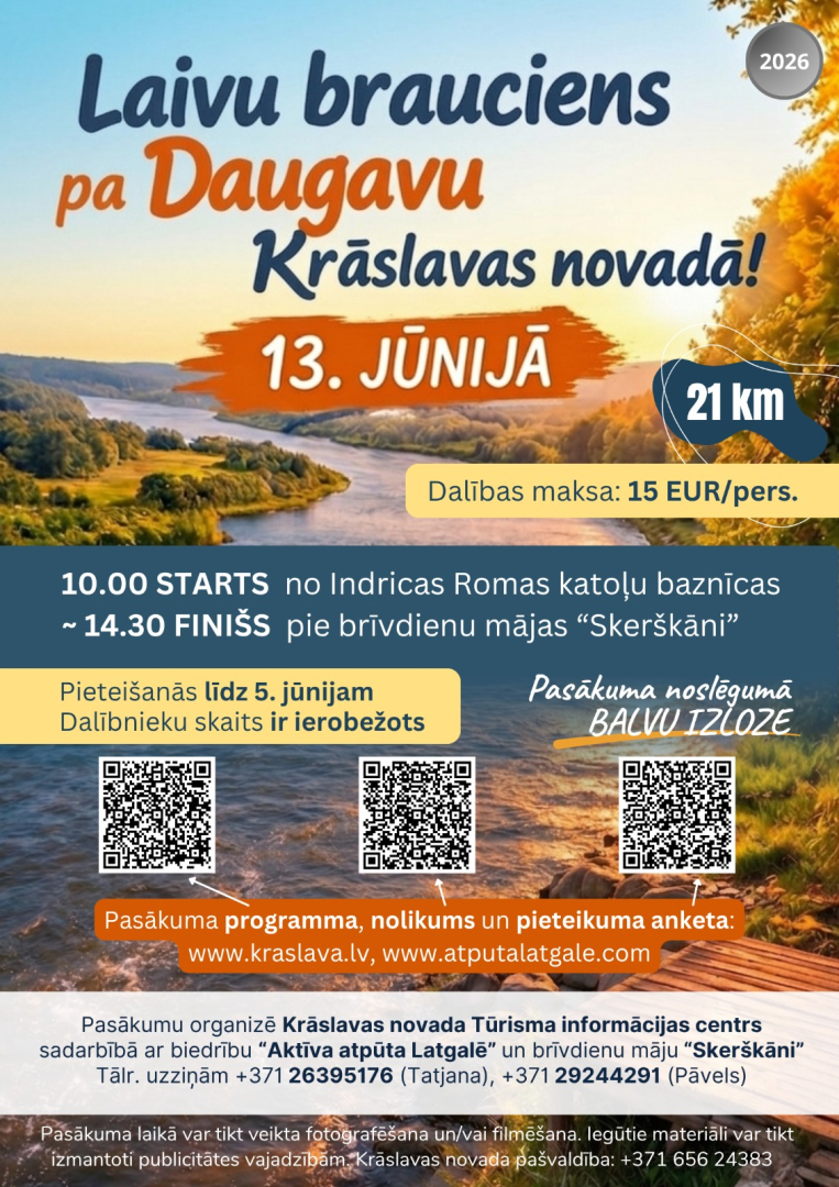 13. jūnijā Krāslavas novada Tūrisma informācijas centrs sadarbībā ar biedrību “Aktīva atpūta Latgalē” un brīvdienu mājām “Skerskāni” aicina piedalīties laivu braucienā pa Daugavu (~21 km).