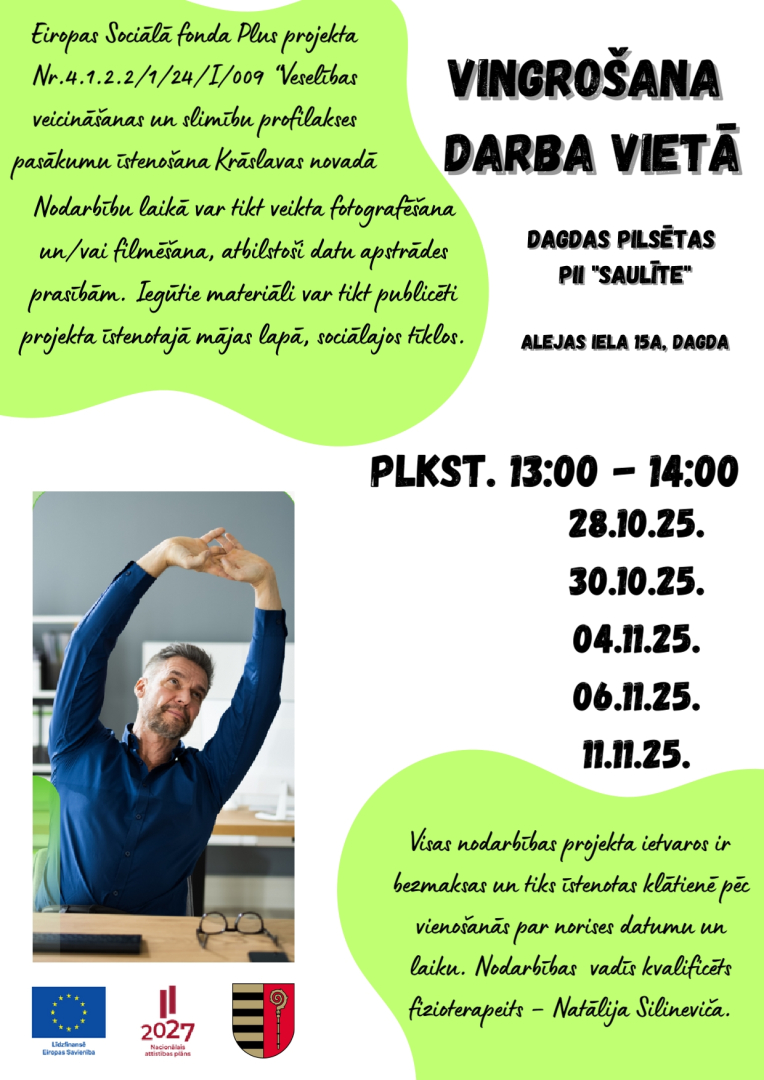 - Fizisko aktivitāšu nodarbības – vingrošana darba vietā